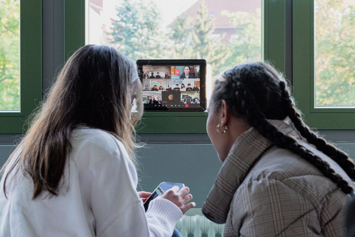 Um dieses große Thema zu umreißen, ging es für die Schüler*innen zunächst in die Recherche, den Austausch und ins Brainstorming. Diese wichtige Einstiegsphase nennt sich im Design Thinking auch Verstehen-Phase und gipfelt nach der eigenständigen Wissenssammlung in der Einhaltung einer Außenperspektive durch das Führen von Interviews. Hier erhielten die Teams Unterstützung durch das Musiker-Duo Rico und Reza von Heartbeat Edutainment: