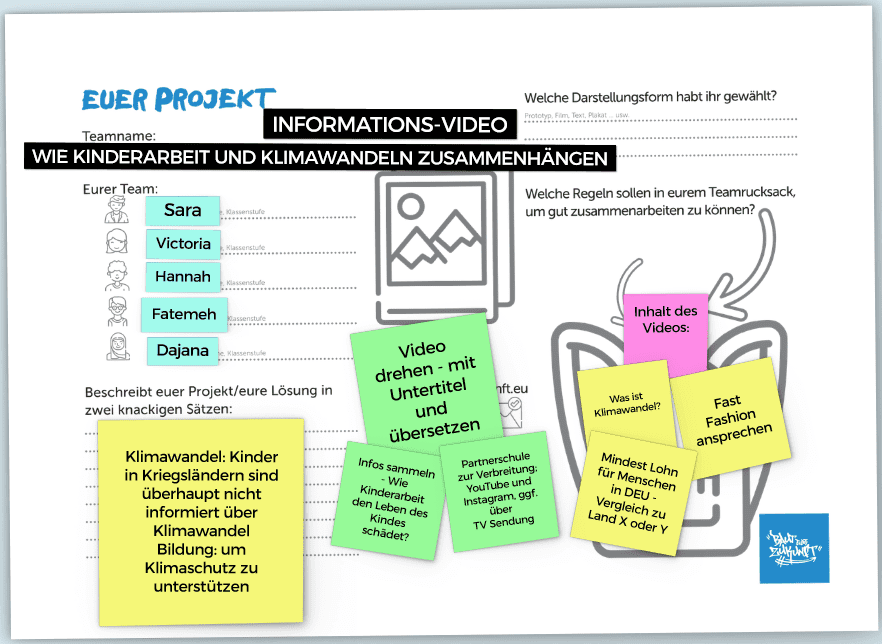 Unseres Erachtens muss das Thema Klimawandel den Kindern und Jüngeren nähergebracht werden, die sonst kaum Berührungspunkte damit haben. Wir haben uns als Ziel gesetzt, Jüngere in Kriegs- und Entwicklungsländern zu erreichen, um sie darüber aufzuklären, wie insbesondere Kinderarbeit und Klimawandel zusammenhängen. Hierfür möchten wir Videos drehen, welche in viele Sprachen übersetzt und mit Untertiteln versehen werden sollen. Wir wollen sicherstellen, dass so viele Menschen wie nur möglich die Videoinhalte verstehen – ganz nach dem Motto: „Informationen von Kindern für Kinder“. Unseren Fokus möchten wir auf Videos über Fast Fashion legen, damit insbesondere die Kinder aus den Produktionsländern ihre eigenen Rechte verstehen. Die Videos sollen auf YouTube hochgeladen und anschließend über Instagram geteilt werden. Über Partnerschulen im Ausland möchten wir erreichen, dass die Videos den Schüler:innen gezeigt werden.