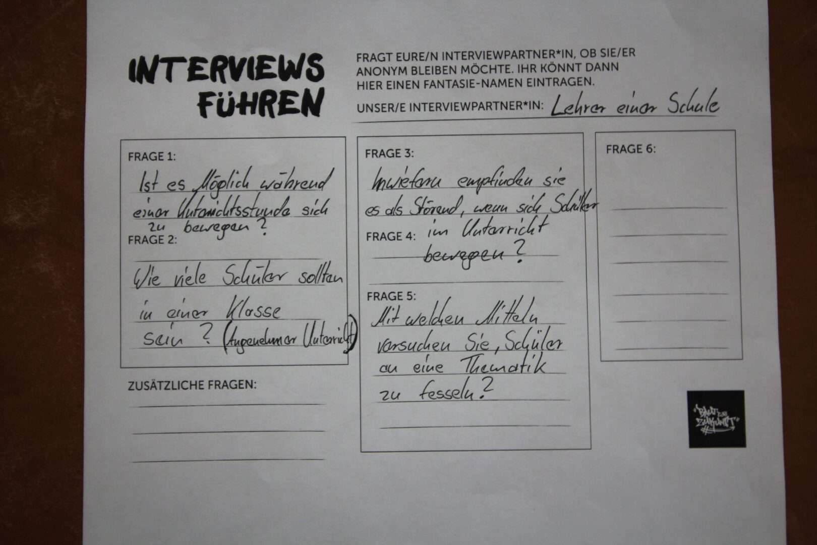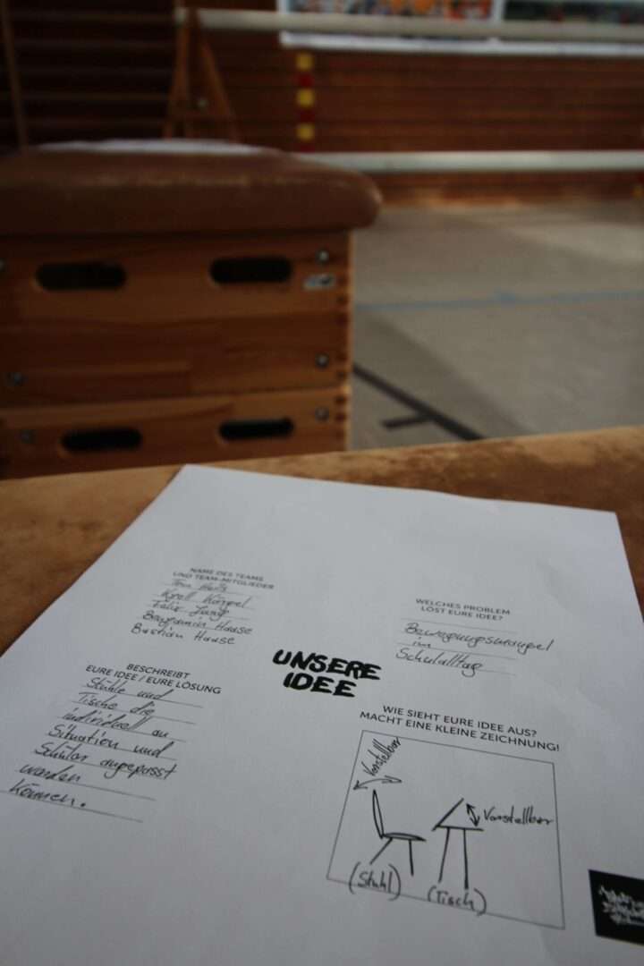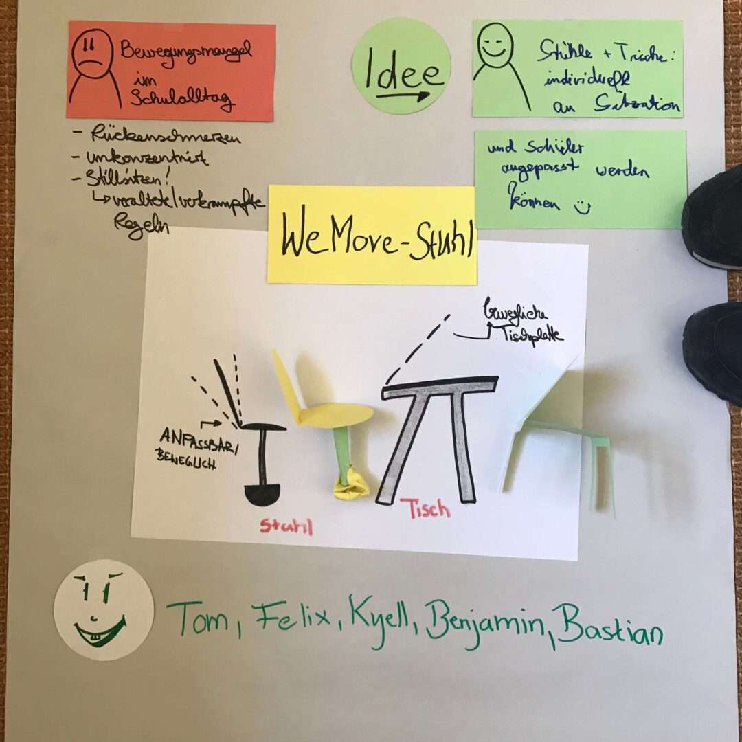 Also haben wir uns die Frage gestellt, wie es möglich sein könnte, sich während der Unterrichtsstunde zu bewegen ohne das es stört. Denn das dauernde Sitzen und Stillhalten ist auch nicht gesund. Wenn man falsch sitzt oder sich zu wenig bewegt, führt das sogar zu Kopf- und Rückenschmerzen, wie wir gelernt haben. Wir finden, dass die schulischen Lösungen, wie Sportunterricht und Pausen auf dem Schulhof oft leider nicht ausreichen.