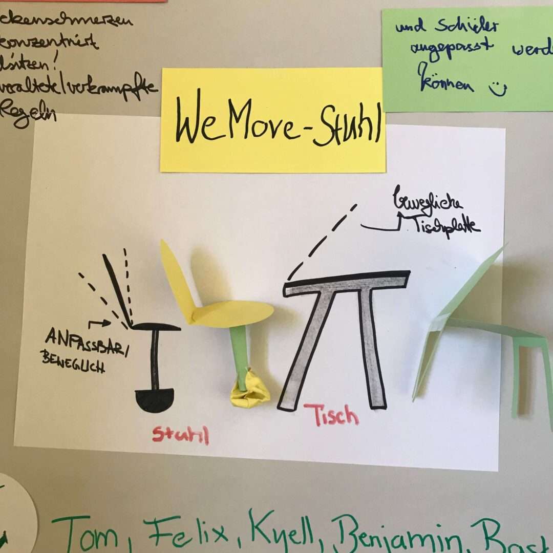Andererseits haben wir den We-Move-Stuhl entwickelt. Er zeichnet sich dadurch aus, dass auch er höhenverstellbar ist und somit an die Größe des jeweiligen Schülers angepasst werden kann. Auch der Winkel der Rückenlehne ist verstellbar. Somit kann man ganz flexibel sitzen, wie man möchte, und ist nicht gezwungen eine immer gleiche, aufrechte Haltung einzunehmen. Ein ganz besonderes Merkmal ist das abgerundete Ende das einen Stuhlbeins. Der Stuhl kippt also einfach um, wenn man nicht aktiv, balancierend sitzt.