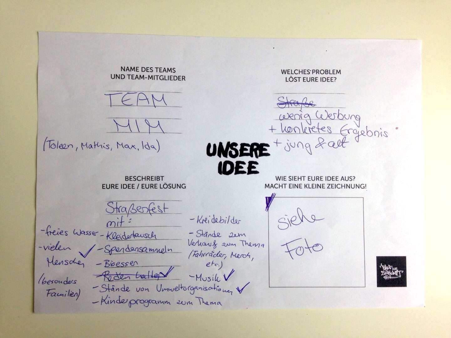 Wir wünschen uns ein von den Demos losgelöstes Straßenfest, dass von Organisationen gefördert wird und nicht in der Schulzeit stattfindet. Viele Generationen sollen dort vertreten sein und gemeinsam über Lösungsstrategien für die Zukunft diskutieren, informieren und arbeiten.