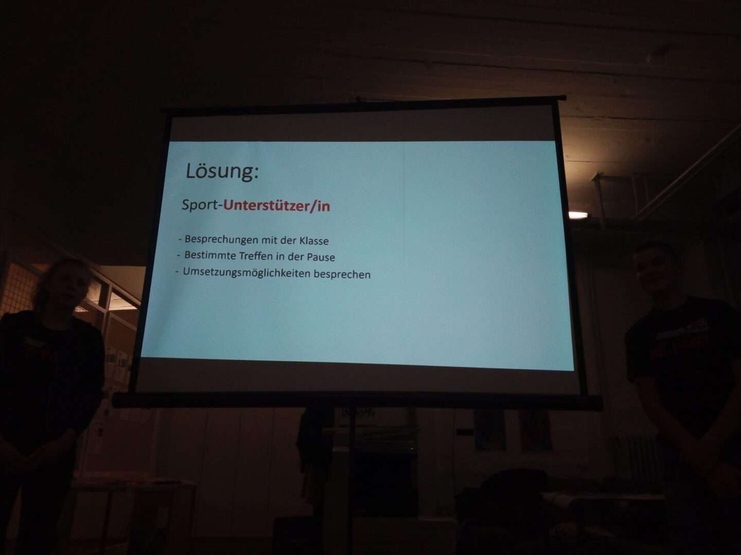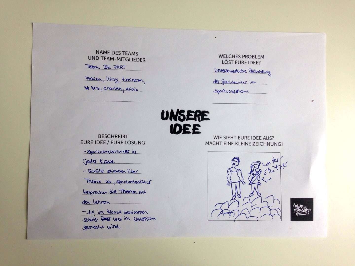 Unsere Idee ist es, Sportunterstützer in jeder Klasse auszubilden. Sie werden von der Klasse gewählt und vermitteln zwischen den Mitschülern und der Lehrkraft. Einmal im Monat stimmen die Schüler gemeinsam darüber ab, wie die Lösungen umgesetzt werden können.