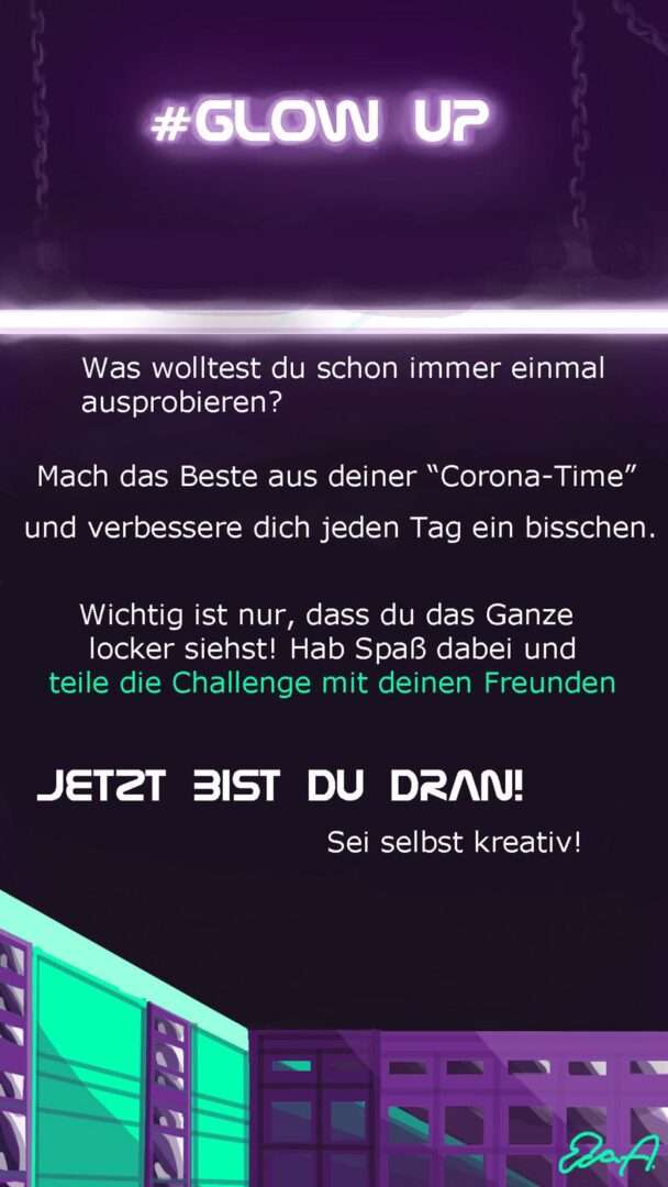 Wie kann man diese ,,Corona-Pause” sinnvoll nutzen? Mit dieser Frage sollte sich unser Schulteam beim Onlinecamp von Baut Eure Zukunft befassen. Nach unserem 2-stündigen Workshop entstand dann das #GLOW UP-Projekt, das wir im Anschluss bei uns in der Schule etablieren konnten. Wir haben uns gedacht, dass so eine Pause, wie wir sie erleben, einem die Zeit und Chance geben kann, sich selbst in Bereichen zu verbessern, in denen man sich schon immer einmal verbessern wollte. Die Idee der Challenge ist es, den Schülern die Motivation zu geben, sich außerschulisch in persönlichen Bereichen zu verbessern oder ihrer Kreativität freien Lauf zu lassen. Ob Sport, Kochen, Werken, einen 10-Finger-Tippkurs absolvieren – alles sollte erlaubt sein! Als Team haben wir dann nach dem Workshop unsere SV gefragt, ob sie uns bei unserer Challenge helfen können. Wir arbeiteten nach dem Workshop mit der SV zusammen an der Idee weiter und es entstanden die Poster, die auch auf unserer Homepage zu finden sind. Bei der Erstellung des Posters war uns wichtig, einerseits das identitätsstiftende Schulgebäude in einer modernen Form abzubilden, andererseits mit einer geschickten Farb- und Schrifttypwahl die Aufmerksamkeit der Schüler/innen zu erregen. Die Klassenlehrer/innen unserer Schule haben uns dabei geholfen, die Idee über ihre E-Mail-Verteiler zu verbreiten, indem sie in ihren Klassen auf den Homepage-Eintrag aufmerksam machten.
