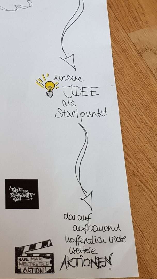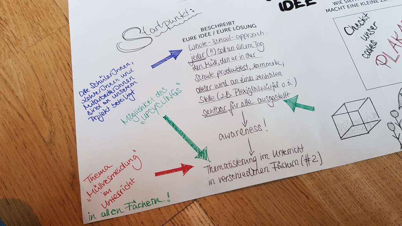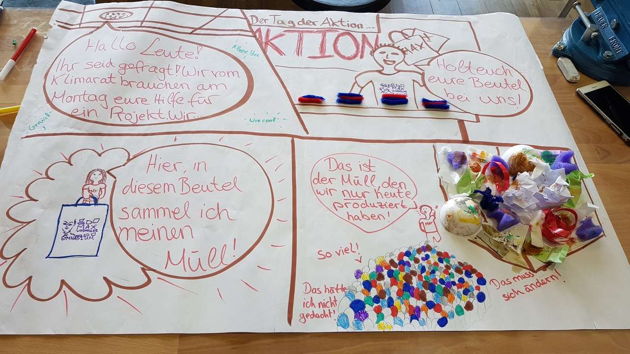 Die Idee der Schülerinnen und Schüler ist es den Müll, der in der Schule an einem Tag produziert wird, zu sammeln. Dieser soll dann gewogen und auf das Jahr hochgerechnet werden. Ziel ist es also die voraussichtlich hohe Menge an Müll zu visualisieren und damit auf die Problematik aufmerksam zu machen. Dies gelingt zum einen, durch das Sammeln von Müll und der Ausstellung des Müllbergs in der Pausenhalle und zum anderen mittels Plakaten, die inhaltlich über die Müllproblematik aufklären. Die Müllsammelaktion muss darüber hinaus vorbereitet werden und stellt durchaus eine logistische Herausforderung dar. Demnach müssen alle Klassen über die Müllsammelaktion informiert werden und vor allem davon überzeugt werden, dass die Müllvermeidung an unserer Schule ein lohnenswertes Ziel ist. Um dies zu erreichen haben die Schülerinnen und Schüler Filme gedreht, die zum einen die Müllproblematik inhaltlich aufarbeiten und zum anderen das Müllproblem in Bezug zur „Wegwerfgesellschaft“ an der Schule thematisieren. Die Filme und die erstellten Plakate, welche beim „Baut Eure Zukunft“ -Workshop erstellt wurden sowie die Vorstellung der Müllsammelaktion sollen im Sinn des „whole school approach“ als Power Point Präsentation vom Klimaparlament in allen Klassen der Schule vorgestellt werden. Ziel der Aktion ist es also, inhaltlich über die Müllproblematik aufzuklären und damit ein Bewusstsein zu schaffen. Dann eine „aktive“ Aktion durchzuführen (Müllsammelaktion mit der ganzen Schule) und daran anschließend aus dem gesammelten Müll in der kommenden Projektwoche ein Upcycling Projekt durchzuführen.
