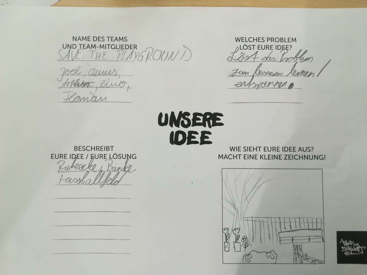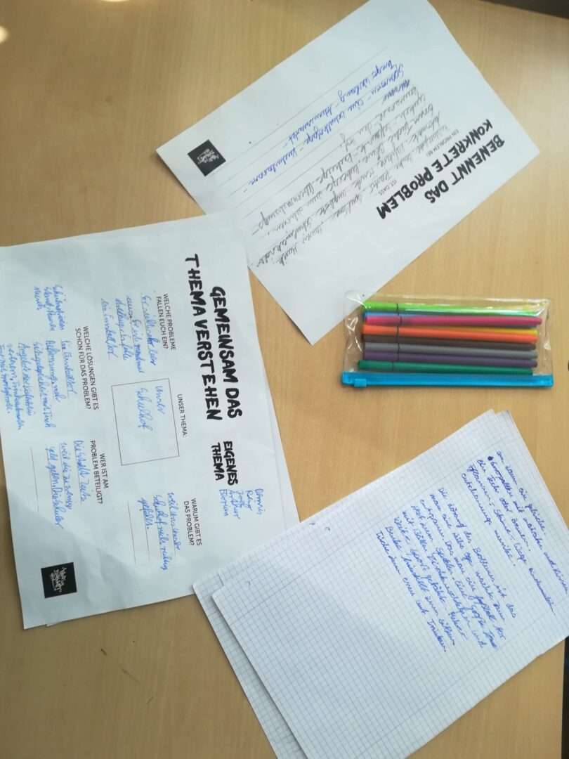 Wir haben den momentanen Zustand unseres Schulhofes als Problem identifiziert und uns damit beschäftigt, wie wir unseren Schulhof umgestalten wollen und welche Schritte es für die Umsetzung braucht.