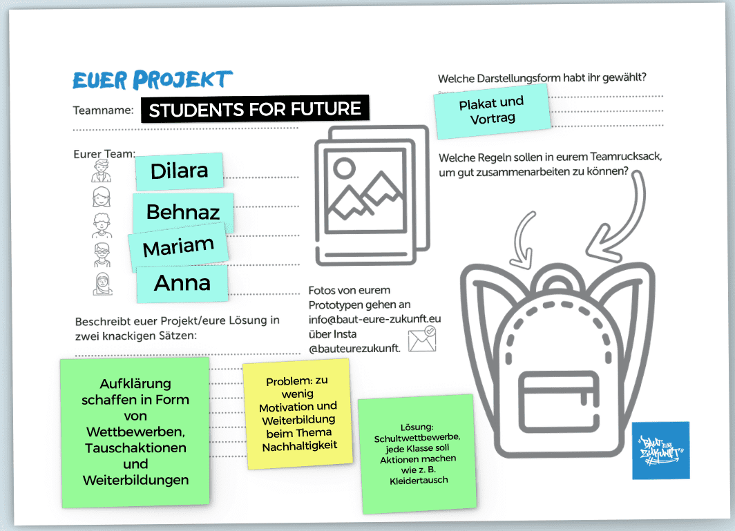 Unseres Erachtens gibt es zu wenig Aufklärung bzw. Weiterbildungen, wenn es um die Themen Nachhaltigkeit und Umweltschutz geht. Mit unserem Projekt „Students For Future“ sollen an Schulen mehr Aktionen zu genau diesen Themen angeboten werden. Im Fokus stehen hier die Weiterbildungen, die beispielsweise in Form von Workshops innerhalb der Klassenverbände stattfinden sollen. Ziel ist es, dass sich Schüler*innen mit dem Thema Nachhaltigkeit regelmäßig beschäftigen, um auch langfristig im Alltag nachhaltig zu handeln. Neben diesen Weiterbildungen sollen zudem Tauschaktionen (z. B. Tausch von Kleidung oder Schulmaterialien) und Wettbewerbe mit Nachhaltigkeitsfokus regelmäßig durchgeführt werden.