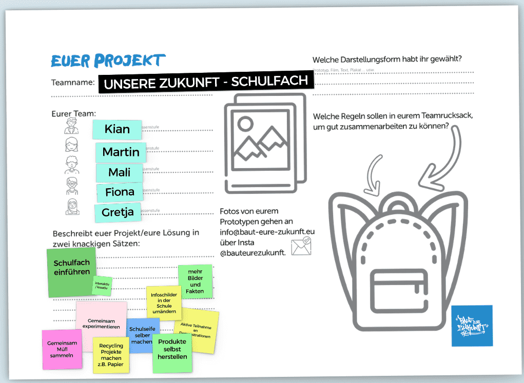 Wir sind der Meinung, dass das Thema Klimaschutz spielerisch in der Schule vermittelt werden sollte. Mit unserem Projekt „Unsere Zukunft“ möchten wir ein interaktives Schulfach an Schulen einführen, welches viel Theorie gegen einen großen Praxisbezug eintauscht. Dieses Schulfach soll sich dadurch auszeichnen, dass es keine Klassenarbeiten, keine Benotung und auch keine Hausaufgaben gibt. Anstelle von Klassenarbeiten sollen Diskussionsrunden auf der Tagesordnung stehen. Die Leistung soll lediglich ins Arbeits- und Sozialverhalten der Schüler:innen einfließen. Im Zuge dieses Schulfaches könnten Schüler:innen zum Beispiel Seife oder Recyclingpapier selbst herstellen. Für dieses Schulfach ist zusätzlich die gemeinsame Teilnahme an Fridays For Future Demonstrationen vorgesehen. Zudem sollen Verbesserungsvorschläge dazu erarbeitet werden, wie zum Beispiel die Papiernutzung auf den Schultoiletten erfolgreich minimiert werden kann.