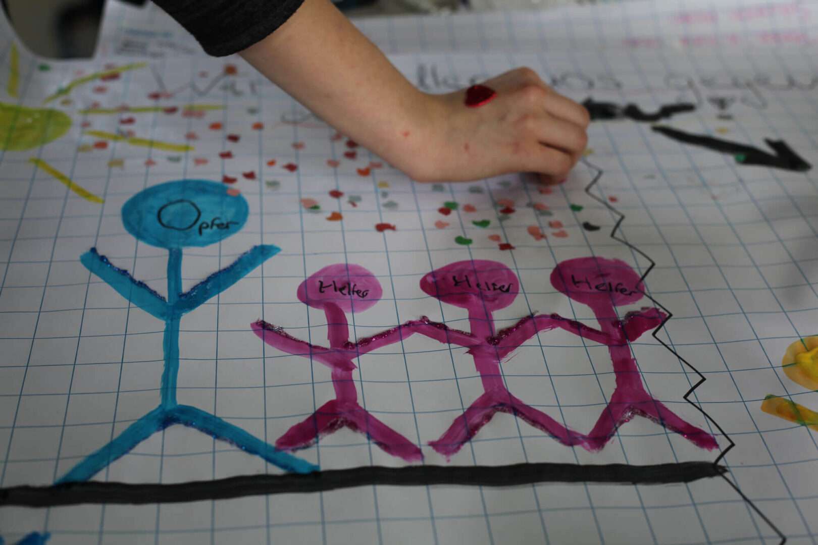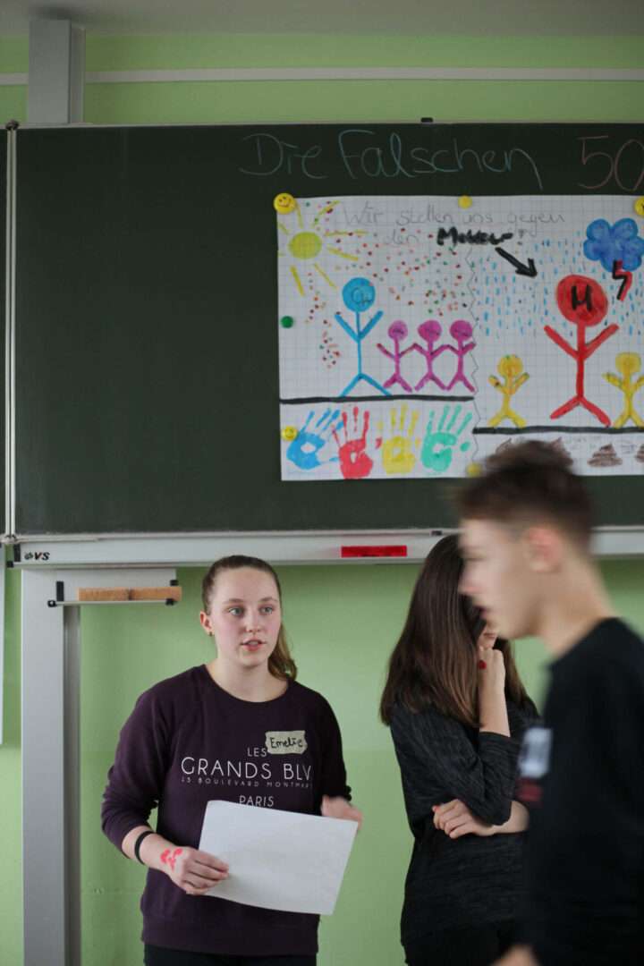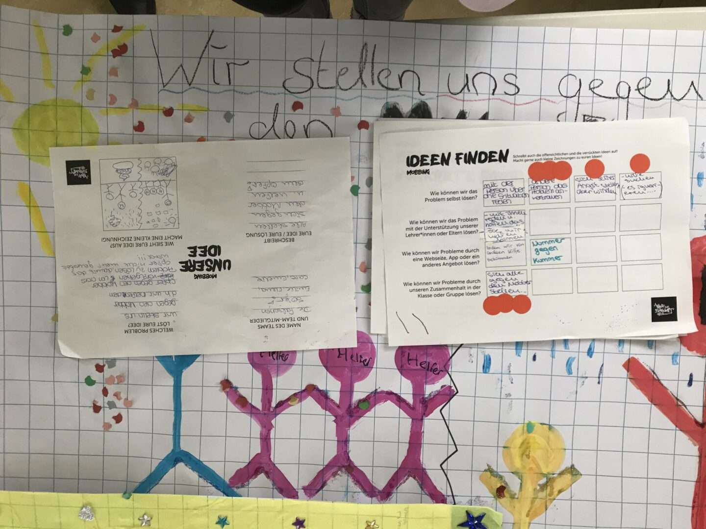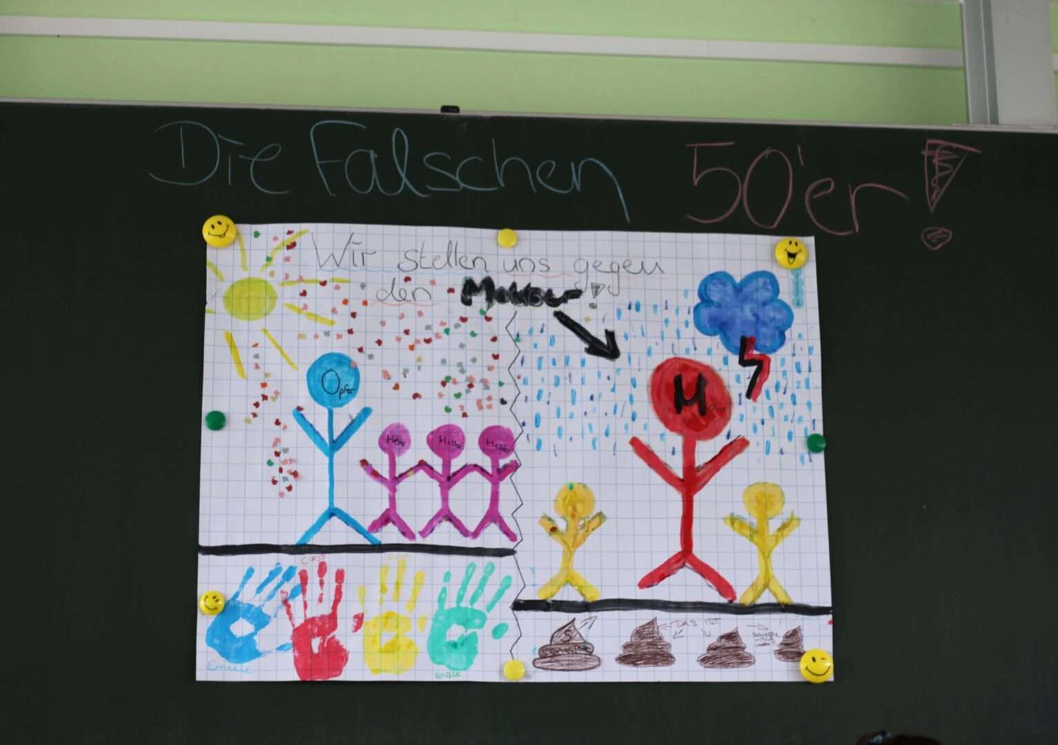 Die Überschrift unseres Projekts ist „Wir stellen uns gegen den Mobber“. Wir haben es aus der Fragestellung heraus entwickelt, wie wir Probleme durch unseren Zusammenhalt in der Klasse oder Gruppe lösen können. Davor sollte sich der Gemobbte vor allem anderen oder einer Person/en anvertrauen können. Sonst kommt das Problem ja gar nicht heraus. Dann sollte die ganze Gemeinschaft dem Opfer helfen und sich gegen den Mobber stellen. Wir wollen damit erreichen, dass das Opfer nicht mehr gemobbt wird und der Mobber merkt, dass sich alle in der Gruppe gegenseitig beschützen. Auf unserem Plakat kann man deutlich sehen, wie auf der einen Seite die Sonne scheint und die Helfer mit dem Opfer gemeinsam im Konfettiregen stehen. Darunter haben wir unsere vier Handabdrücke wie Unterschriften gedruckt. Auf der anderen Seite steht der Mobber im Regen und darunter sind lauter Shit-Emojis die zeigen sollen, was wir von Mobbing halten.